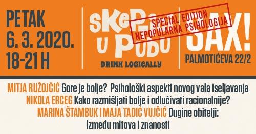 Društvo za promicanje znanosti i kritičkog mišljenja zajedno s Nepopularnom psihologijom organizira posebno izdanje već uhodanog programa u Saxu, Skeptici u pubu, 6.3.2020. godine od 18 do 21 h. Povodom drugog rođendanda portala Nepopularna psihologija organizirano je posebno izdanje Skeptika u pubu obilježeno trima aktualnim temama iz psihologije.